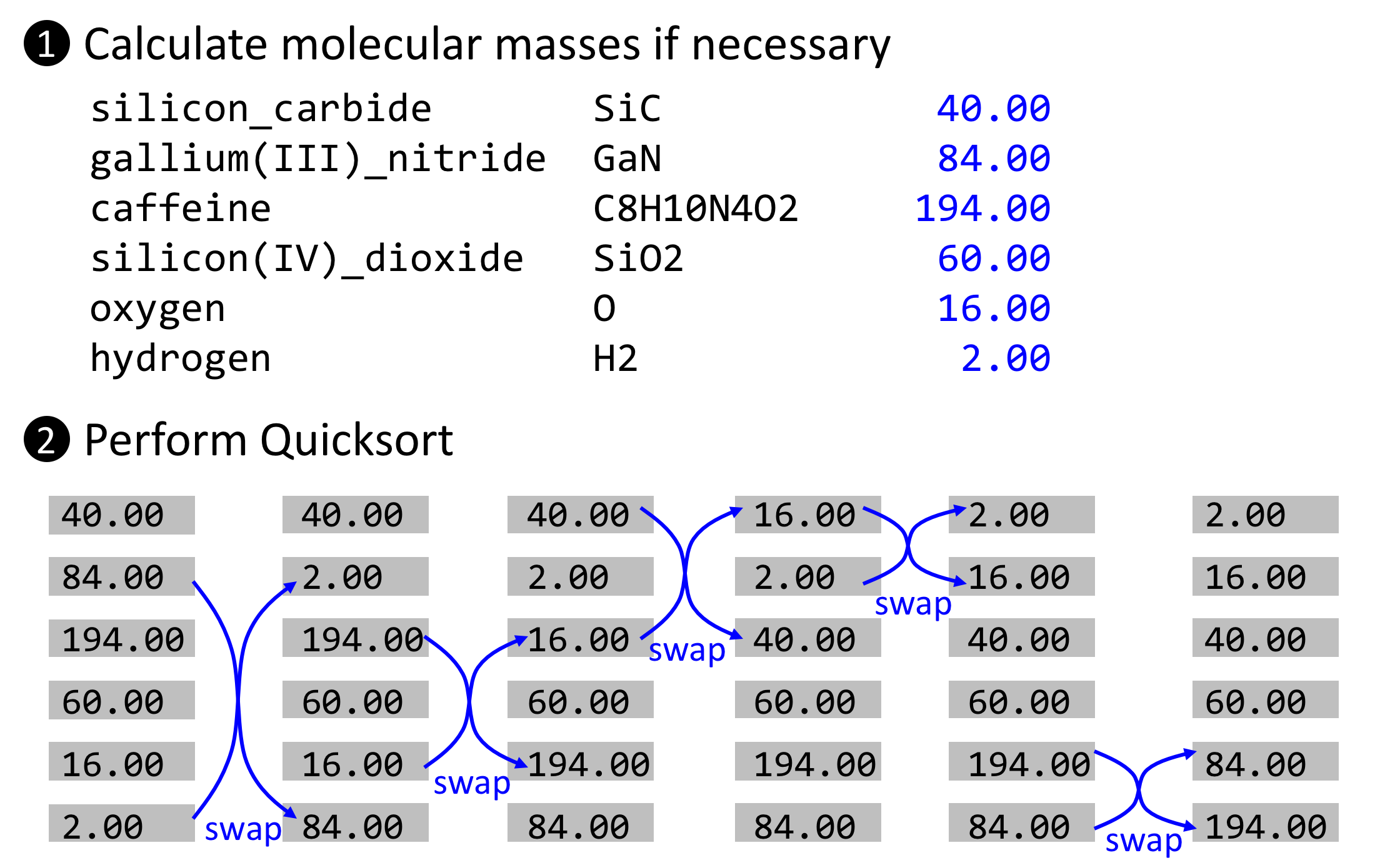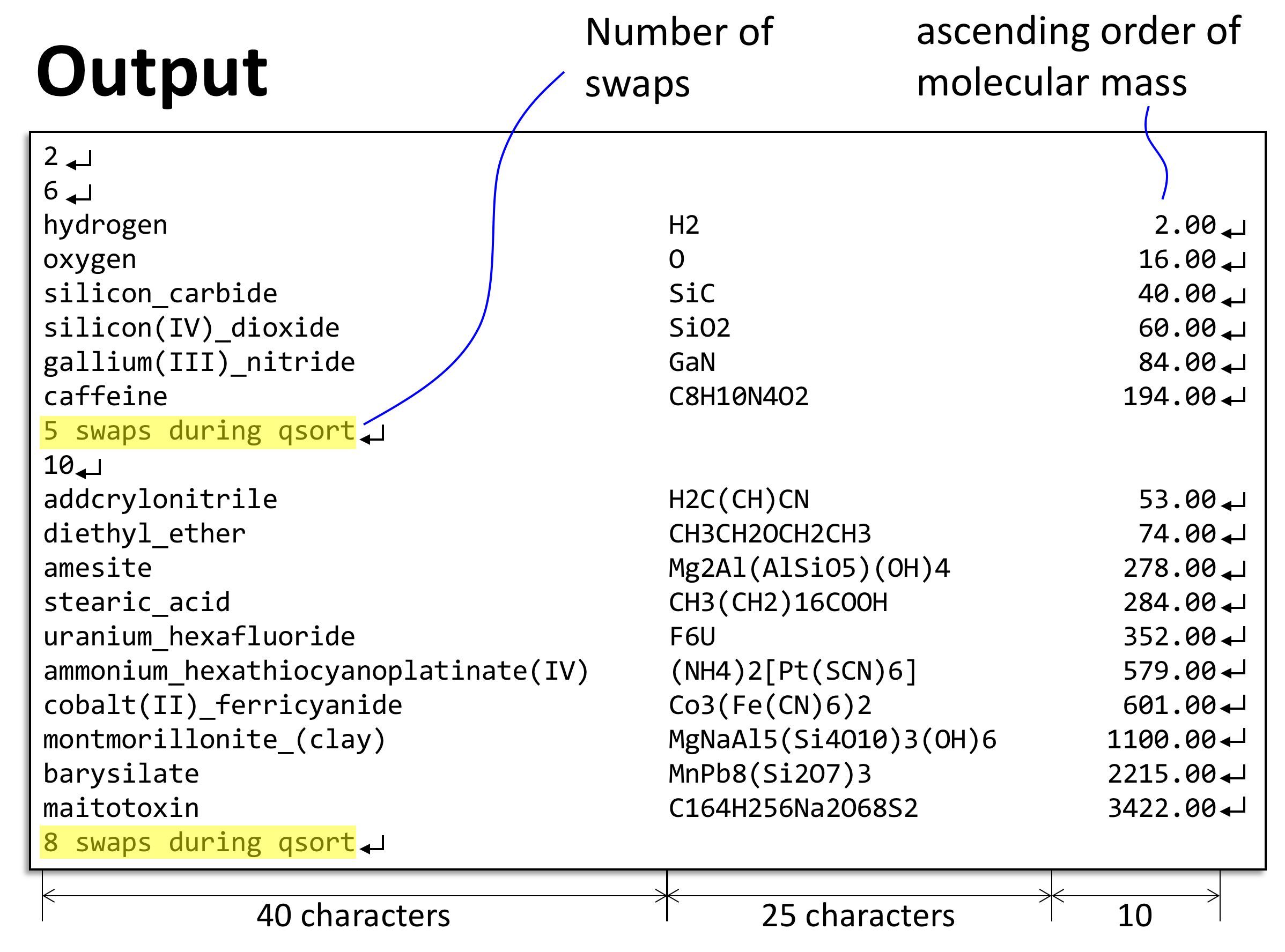 - Print out the molecules and also report the number of swaps used during Quicksort