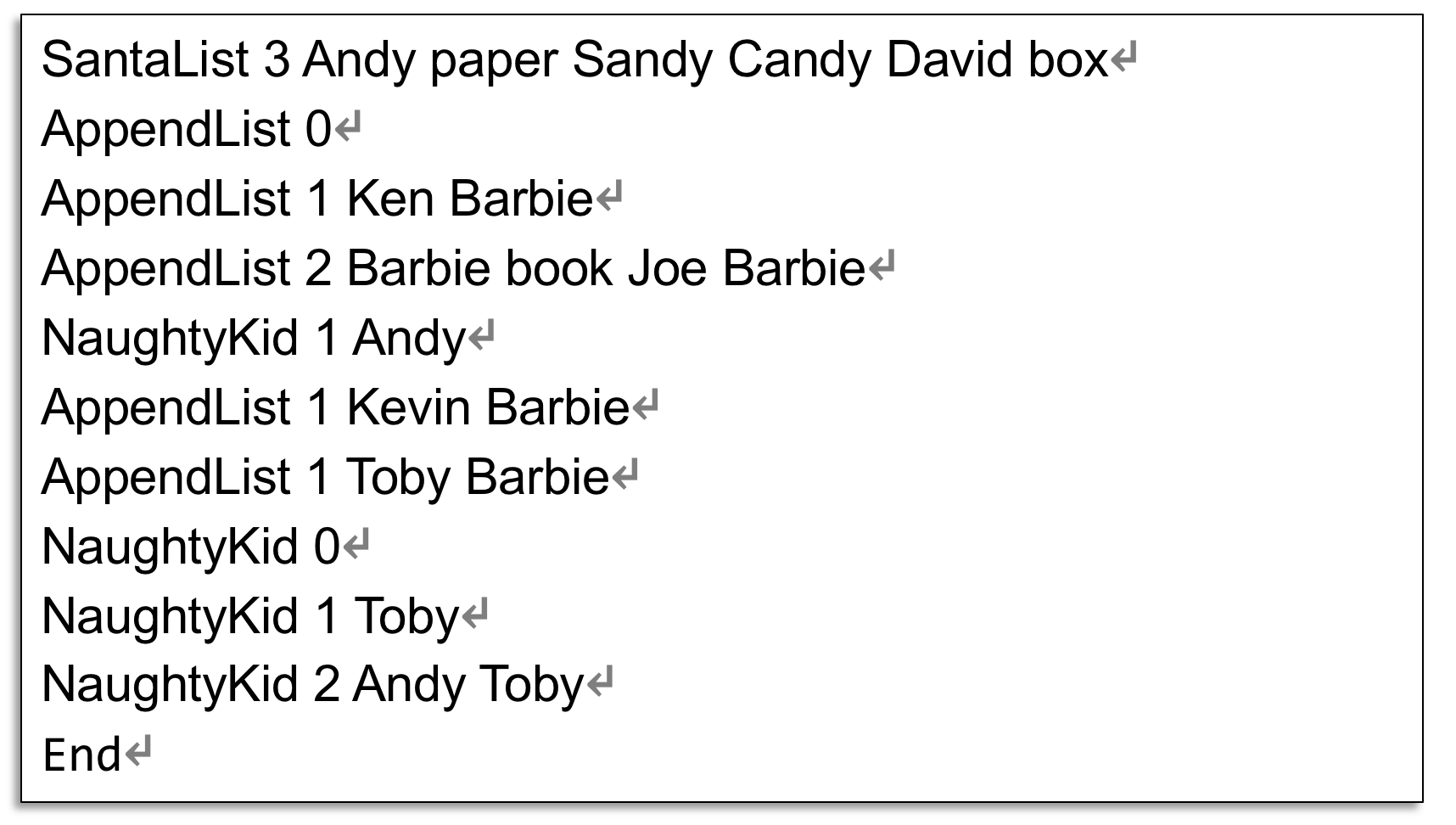 ⁍ AppendList: The gift list can be appended (good kids should be placed before naughty kids)