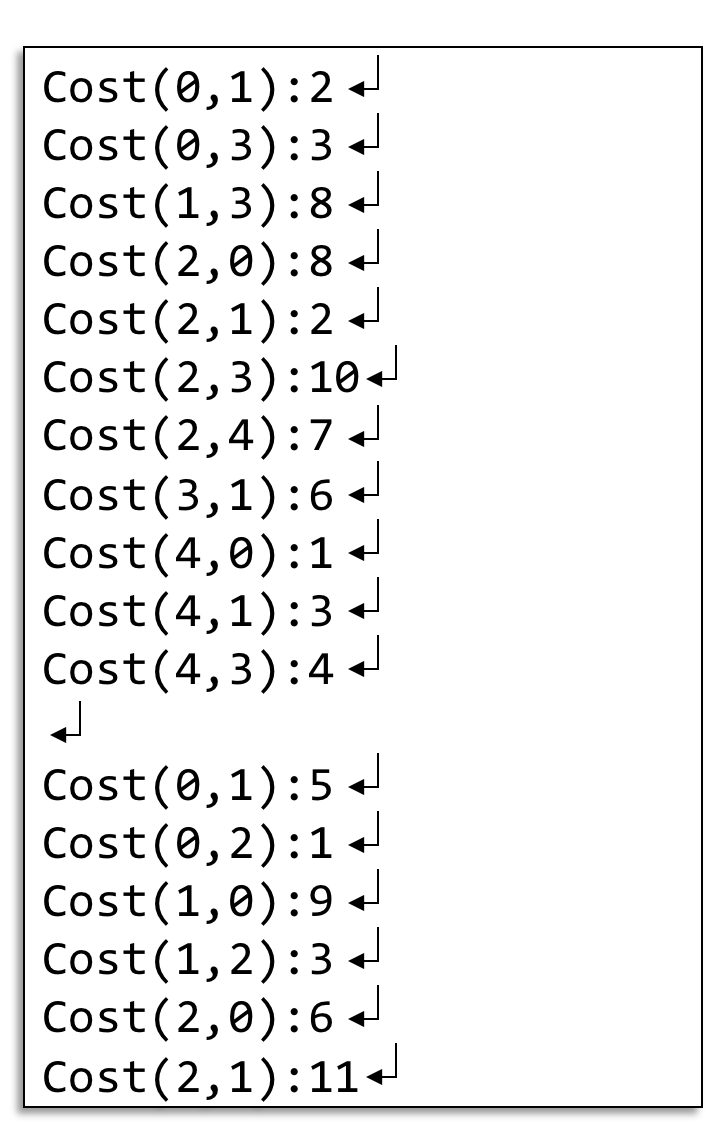 - Print out the cost for each pair in row major order.
