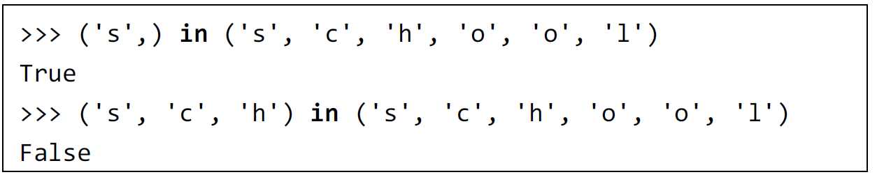 ('o', 'o') in STuple('s', 'c', 'h', 'o', 'o', 'l') = True