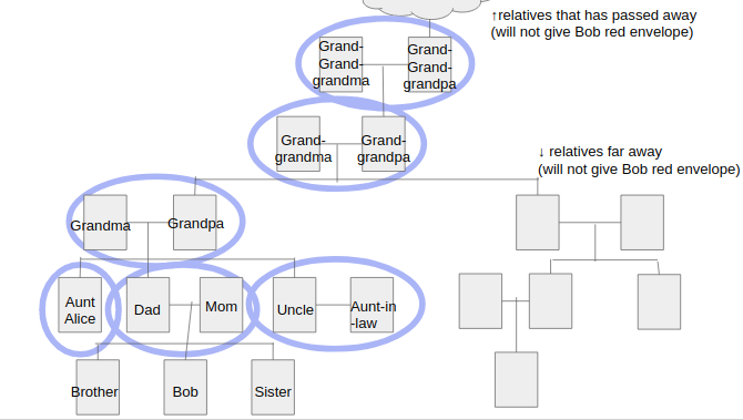 However, only his parents, uncles (disregard uncle-in-law), aunts (disregard aunt-in-law), grandparents, grand-grandparents, grand-...-grandparents will give him one red envelope in New Year's Eve (circled in the family tree), so the family tree he cares looks like the following graph. Bob calls this version of family tree "New Year Family Tree". (Relatives in blue nodes are those who will give Bob red envelopes)