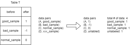 The table T consists of 2 part, before and after, which means the label y should be afteri if y is as same as beforei. Otherwise, y will become unlabeled.