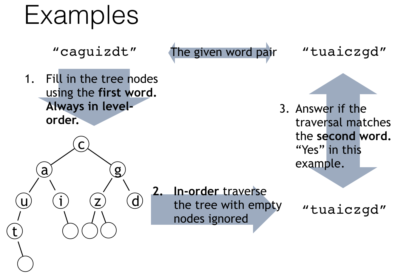 Anagrams means "變位字" in Chinese. Assume we have a word "HEART" and we want "HEART" to be the level-order sequence and "EARTH" to be the in-order sequence, the tree would exist. However, if we set "EARTH" to be the level-order sequence and "HEART" to be the in-order sequence, then the tree will not exist.