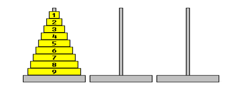 - Each move consists of taking the upper disk from one of the stacks and placing it on top of another stack i.e. a disk can only be moved if it is the uppermost disk on a stack.