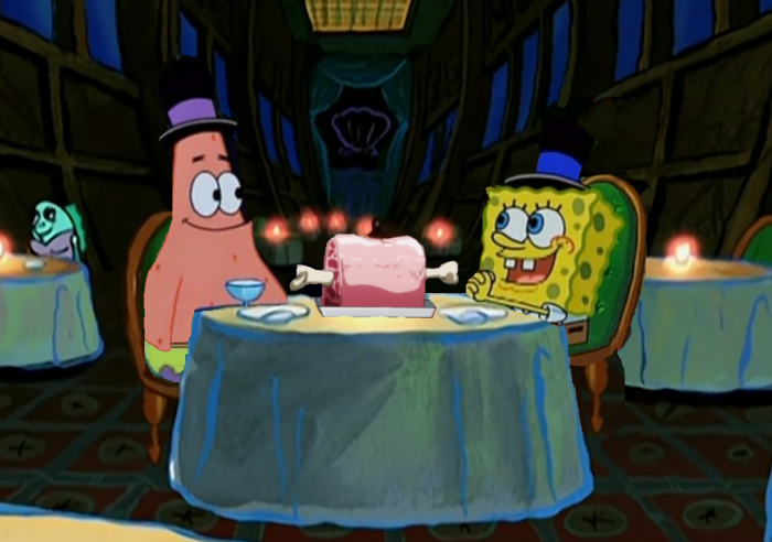 After finishing dinner in SAO, it's time to have the bill. But Spongebob only has bubble-money and Patrick only has rock-money.