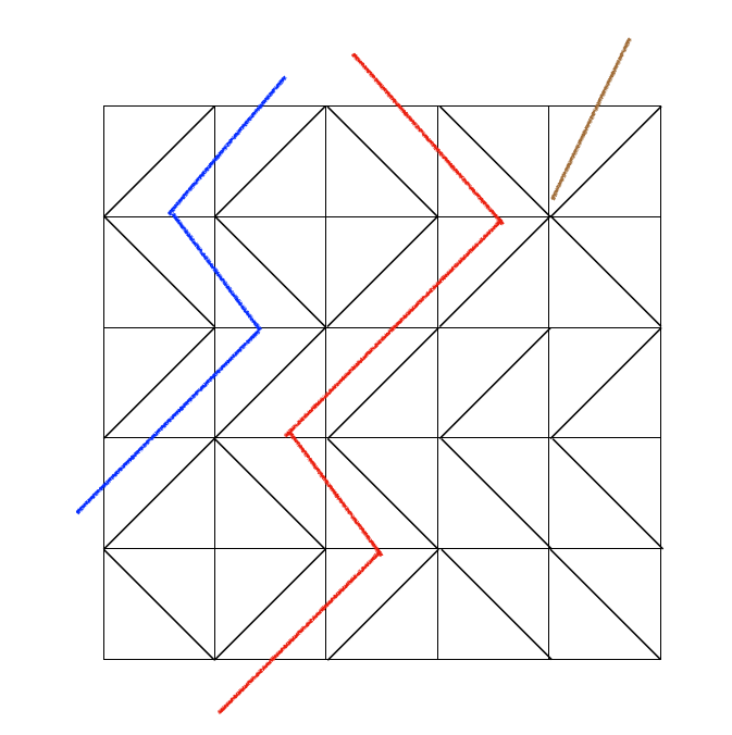 The following figure is a sample. If you drop the ball at column 2, the ball will fall out at the left side. If you drop the ball at column 5, the ball will stuck in the board. If you drop the ball at column 3, the ball will eventually fall out at column 2.