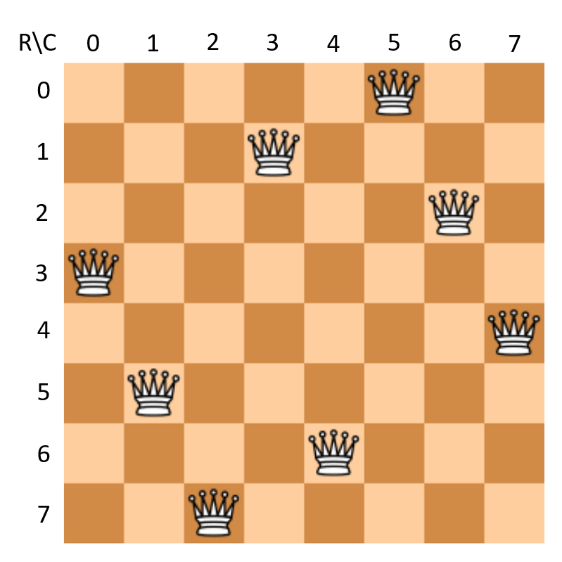 The eight queens puzzle is the problem of placing eight chess queens on an 8 times 8 chessboard so that no two queens threaten each other; thus, a solution requires that no two queens share the same row, column, or diagonal.
