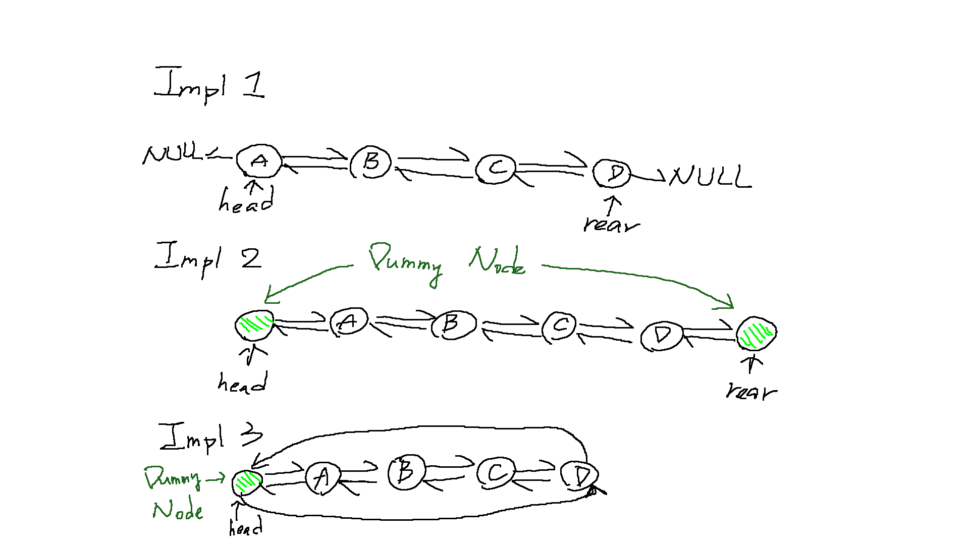 In this problem, you are asked to use doubly linked list to reduce the time complexity. Three typical implementations as follows are possible. You can choose your favorite one, e.g., Impl 1 or Impl 2.