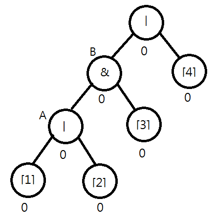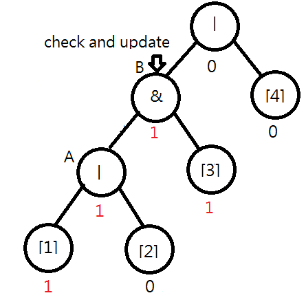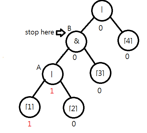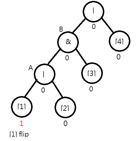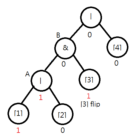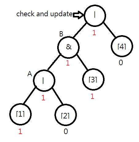 Consider the following syntax tree for "|&|[1][2][3][4]". Assume [1] is flipped. You will find that the value of node A should be changed to 1|0=1. Moreover, you note that the value of B remains unchanged, i.e., 1&0=0, and the checking process can stop.