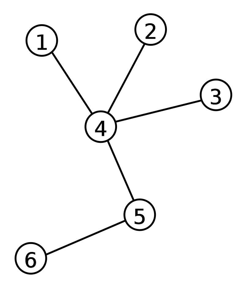 For example, the Prufer code of the tree below is {4, 4, 4, 5}. (the order of the leaf removed is 1, 2, 3, 4)