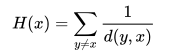 x is the node that we want to know its centrality, while y can be any other nodes in the network. d(y,x) means the difficulty of the least difficult path from y to x in our task. If there are no paths from y to x, 1/d(y,x) is 0.