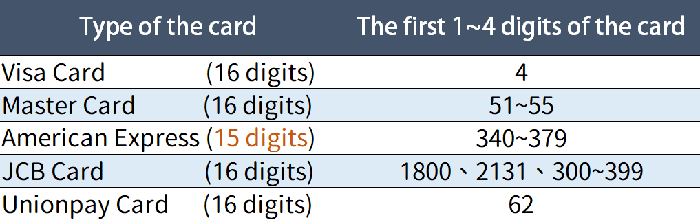 To identify the card brand, we need to check the first 1~4 digits on the card, please check the table below: