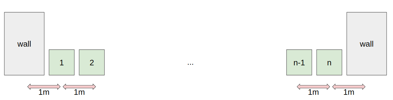 Inside a classroom, there are n seats numbered from 1 to n in a row and there are walls on the left of the 1-st seat and on the right of the n-th seat. m students numbered from 1 to m are coming to class. The distance between to neighboring seats or walls is 1 meter. Initially there are no people on the seats.