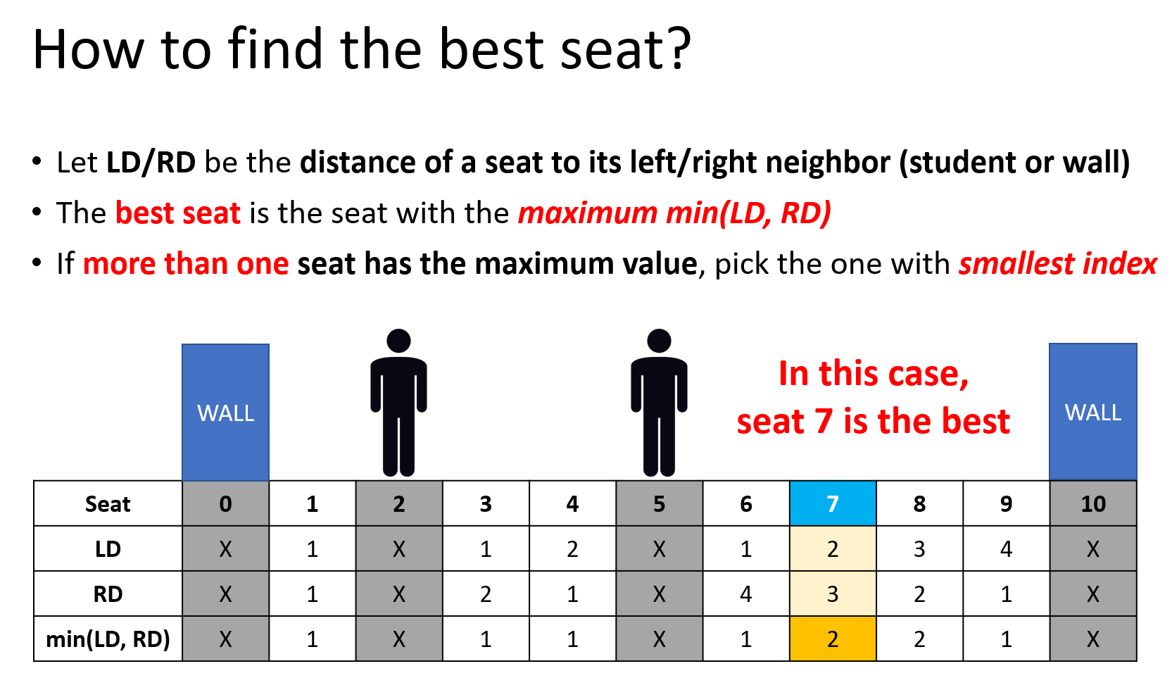 Each student takes a seat and leaves the seat at some time and they will take the seat that is farthest from the wall and the other people. If there are multiple seats to choose from, he or she will choose the leftmost one (i.e. the seat with smallest number).