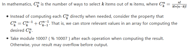 Because the result may be too large to represent in computer, you’re asked to print the result module 10007, which means you should answer “70” if result = 10077.