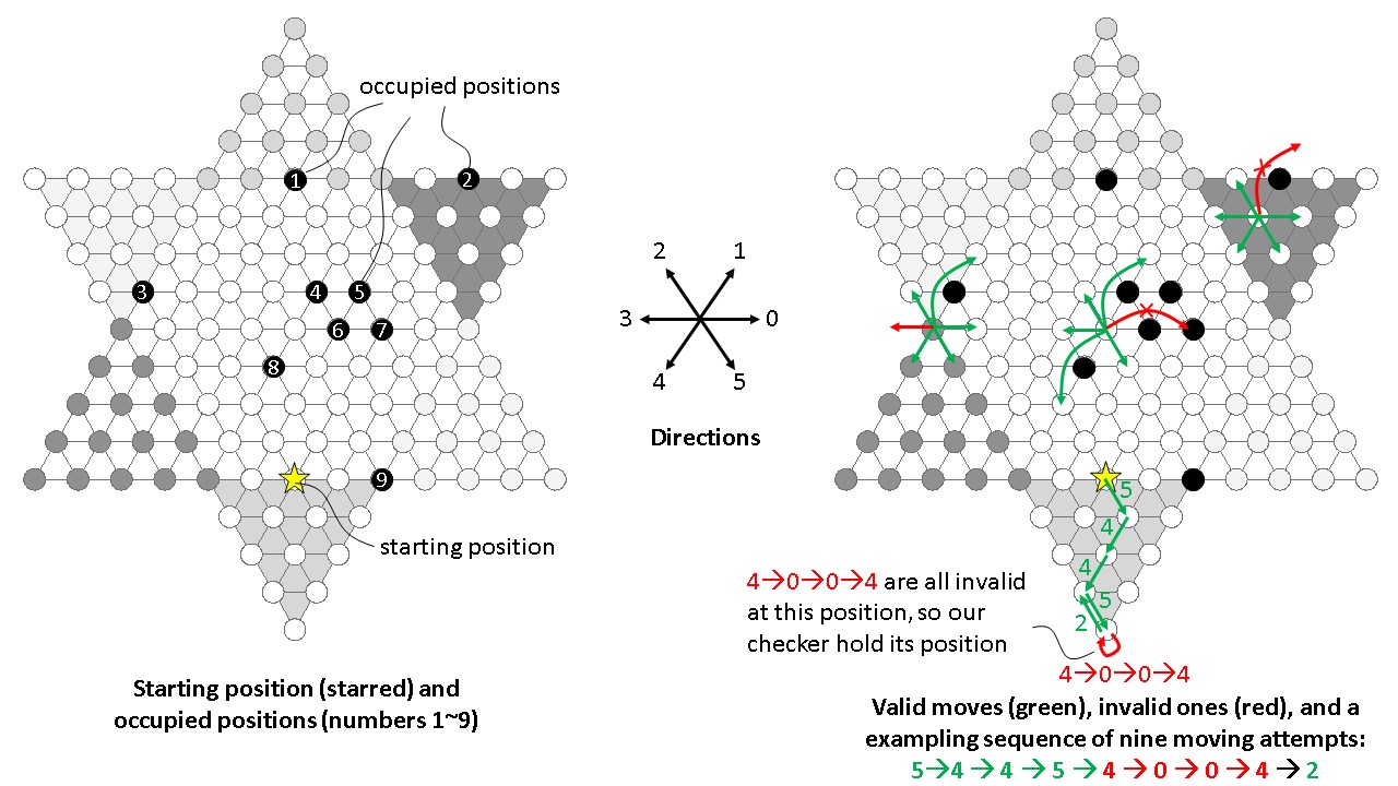 We want to simulate a Chiness checker piece that randomly walks on the gameboard. The following figure dipicts the shape of the gameboard, the starting position of our checker piece (the starred position), nine positions (1~9) that are already occupied by other checker pieces, and six moving direcrtions (0~5) of our checker piece. The right half of the figure dipicts examples of valid (green) and invalid (red) moves of Chinese checker pieces.