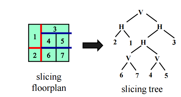 Floor planning is usually represent as a tree which contains 3 kinds of nodes: leaf node, H node, and V node.