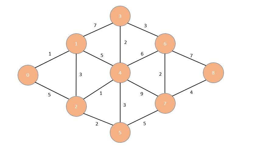 For example, the distance of the shortest path from vertex 0 to vertex 8 is 16