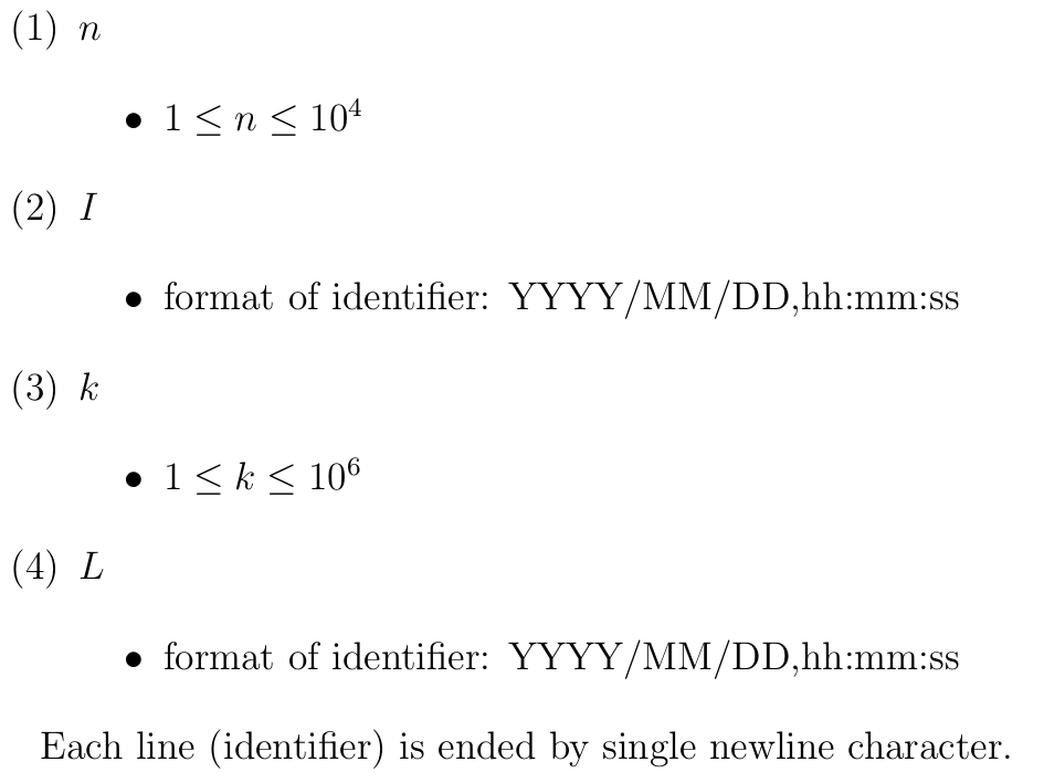 10 2020/06/01,00:00:00 2020/06/01,00:00:11 2020/06/01,11:59:59 2020/06/02,01:02:03 2020/06/02,11:22:33 2020/06/02,12:34:56 2020/06/07,11:22:33 2020/06/07,23:59:59 2020/06/08,04:05:06 2020/06/11,07:08:09 10 2020/06/01,00:00:00 2020/06/02,00:11:11 2020/06/03,11:59:59 2020/06/04,03:02:01 2020/06/04,11:11:11 2020/06/04,12:34:56 2020/06/07,11:22:33 2020/06/07,23:59:59 2020/06/08,04:05:06 2020/06/11,09:08:07